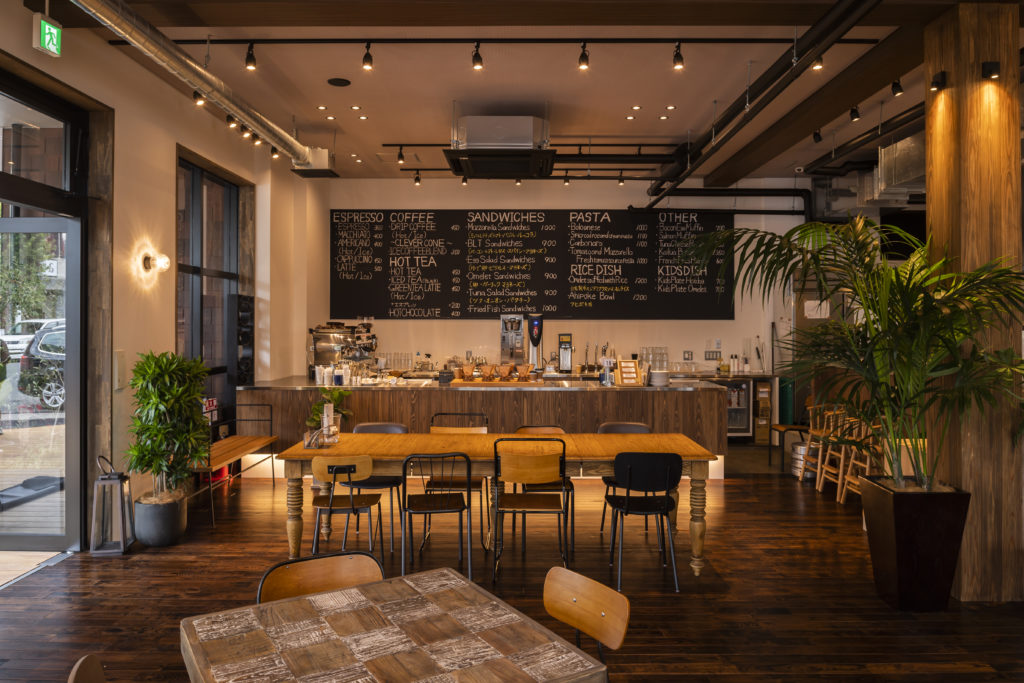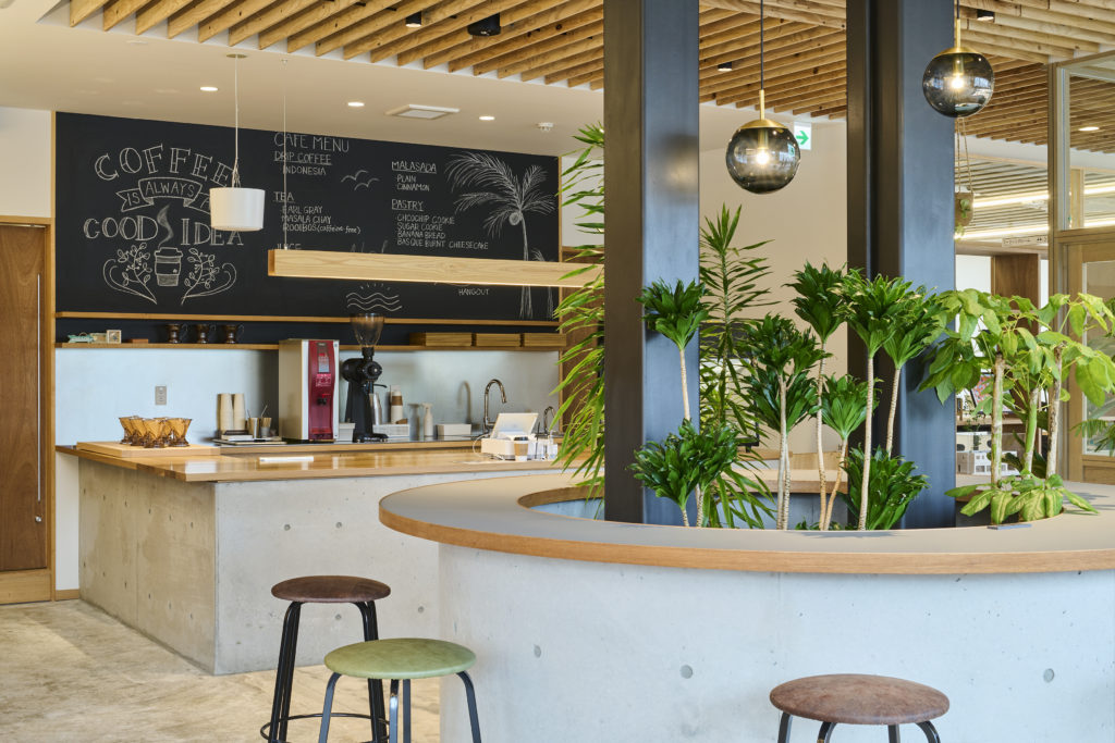 吹き抜けの空間になっており、2階のオフィスまで心地よいカフェの雰囲気が広がります。