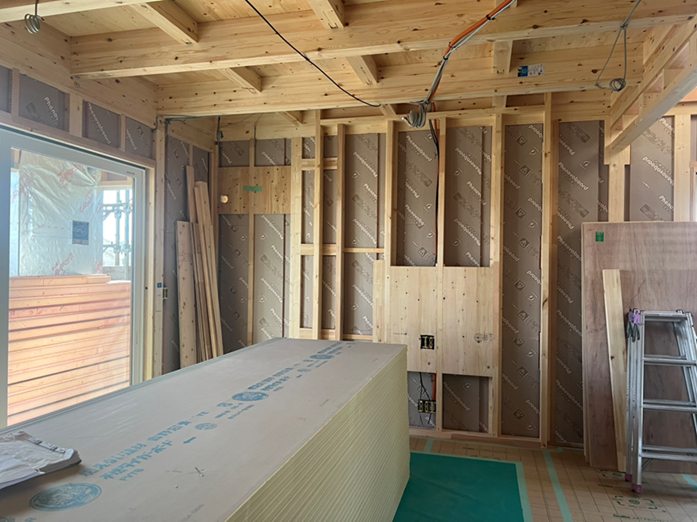 壁には断熱材を入れ、エアコンやテレビ等を取り付ける部分には、下地となる板を張ってもらっています。