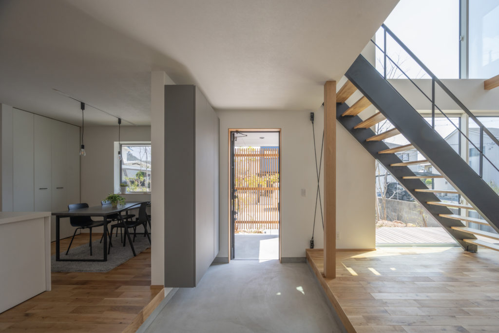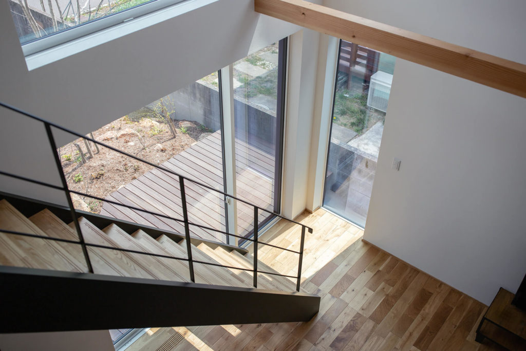 階段まわりには吹き抜けを設け、上下階のつながりと開放感をプラス。