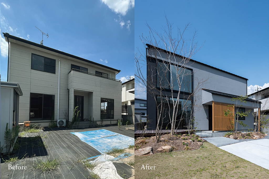 外観は、格子デザインをアクセントに取り入れ、落ち着きのある和モダンの佇まいへ。