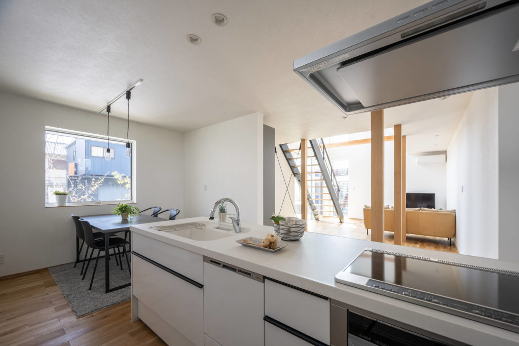 室内に入ると、壁で仕切らない一体感のあるLDKが広がり、料理をしながら会話が生まれたり、家族の気配を感じながら過ごせる心地よい空間になっています。