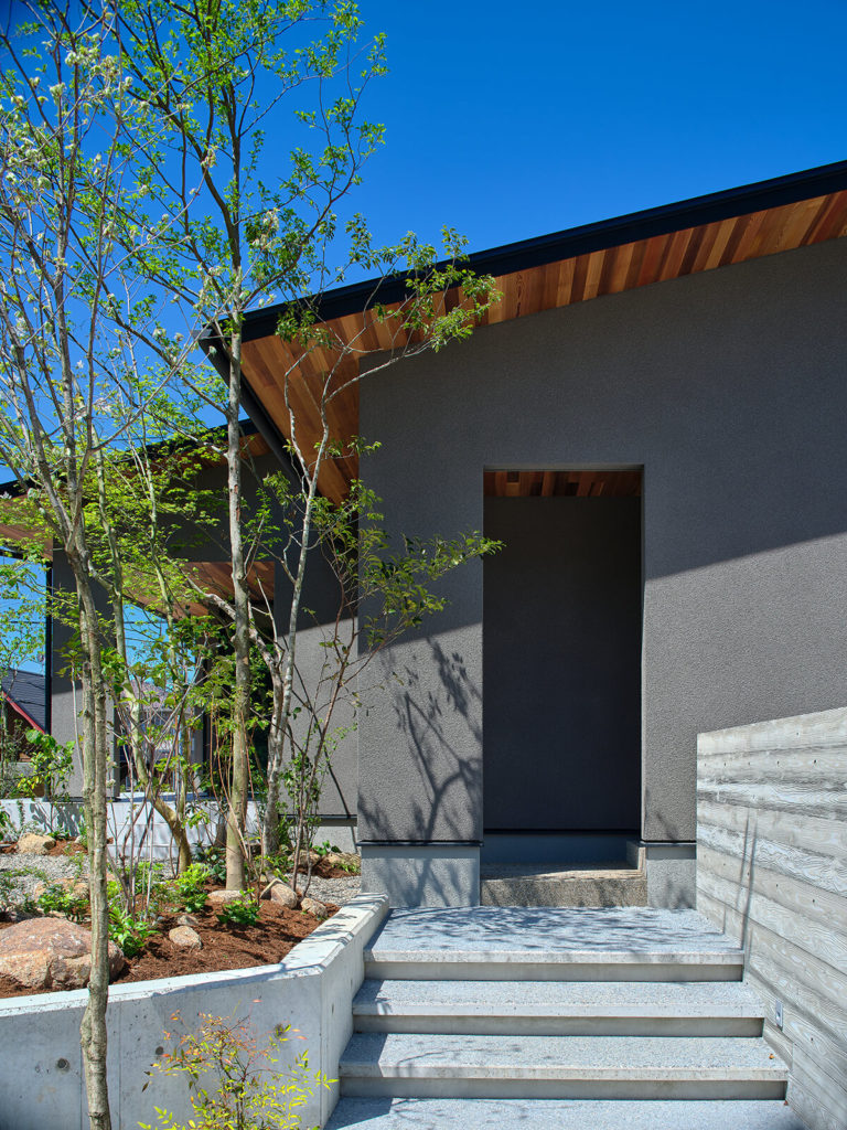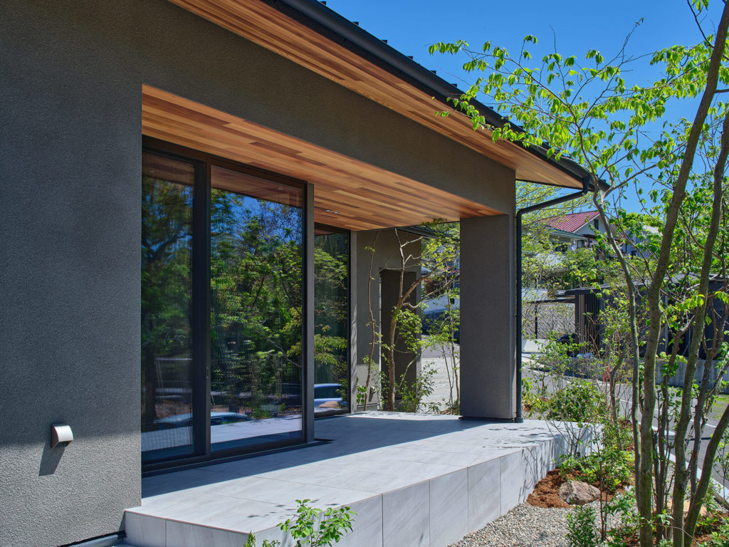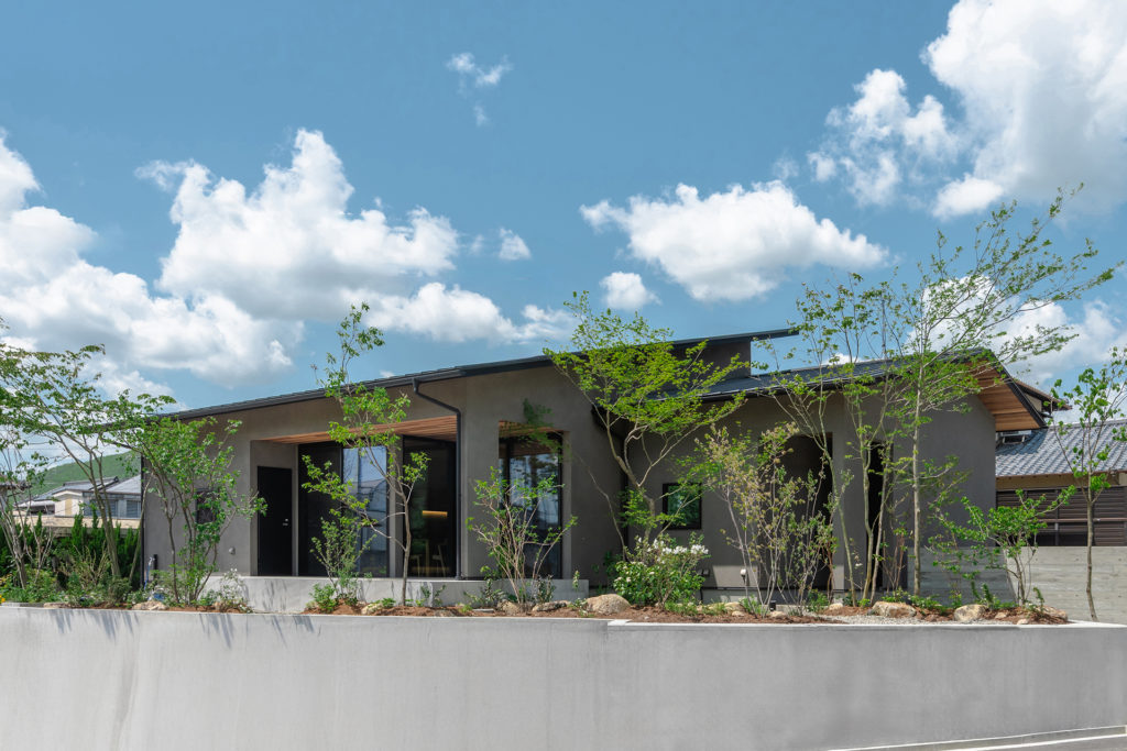 緩やかな片流れの屋根と、深い軒が印象的な和モダンの外観は、落ち着いた佇まいの中に、住まう人の美意識がにじみ出る上品な表情を湛えています。