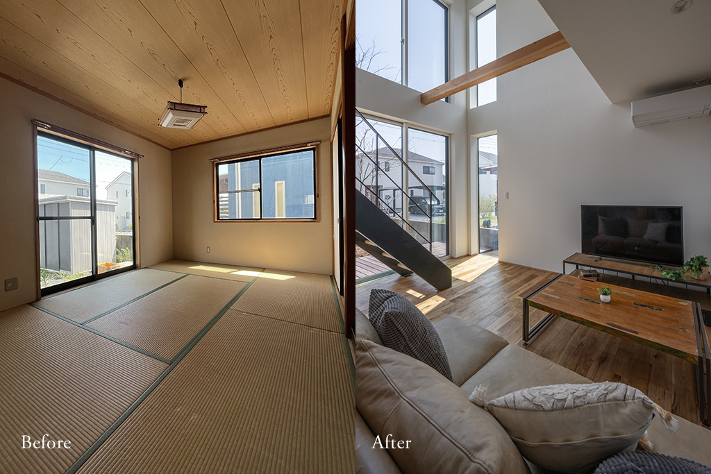 改修前は和室だった空間を洋室リビングへ。
