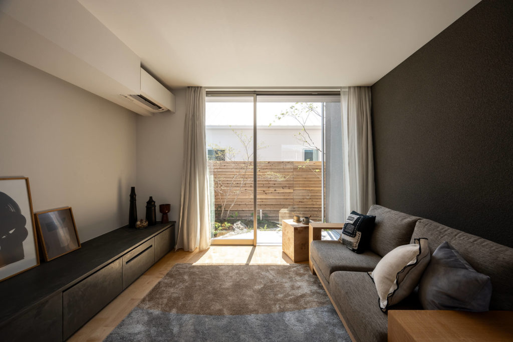 リビングは囲まれた庭へ自然につながり、家族だけの時間に集中できる設計です。