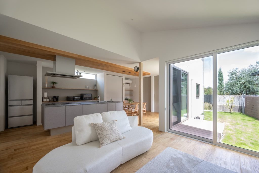 大開口から庭まで視線が抜け、光と風を柔らかにとりこむLDK。家の中にいながら、外とひと続きの心地よさを感じます。