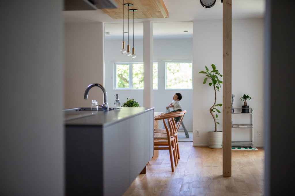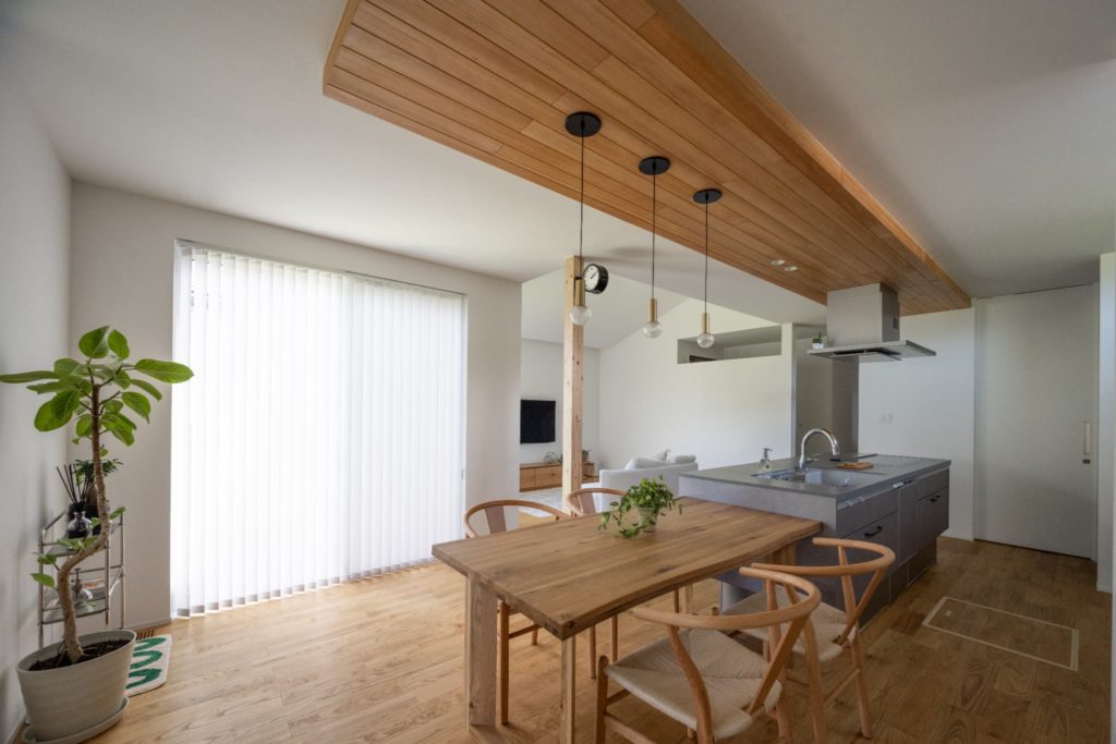 下がり天井とペンダントでダイニングをゾーニング。家族の声が自然に届く距離感で、食事も会話もゆったり深まります。