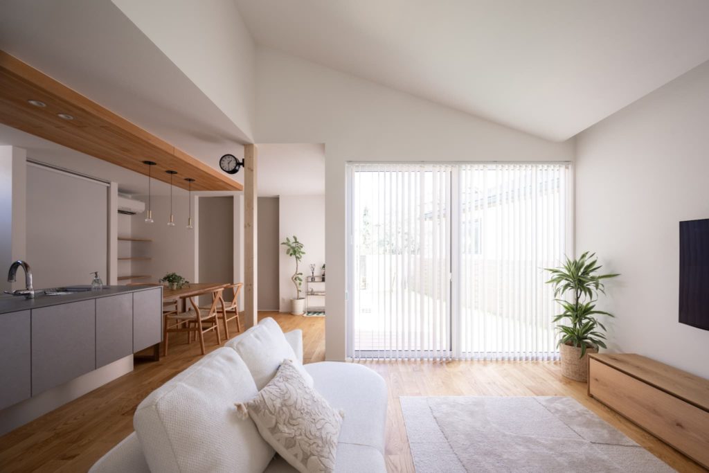 勾配天井が空間にのびやかさを与え、バーチカルブラインドが光をやわらかく整えます。